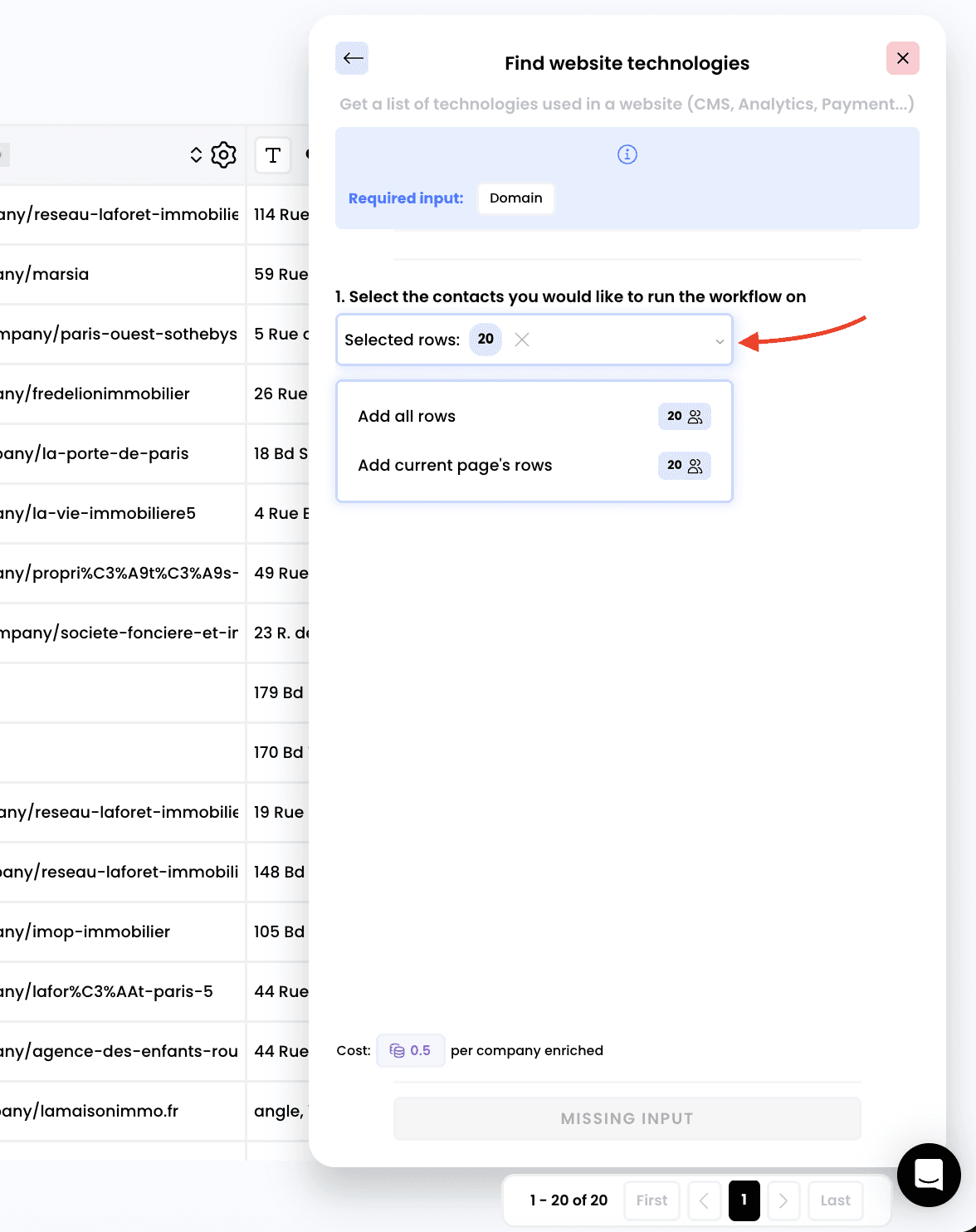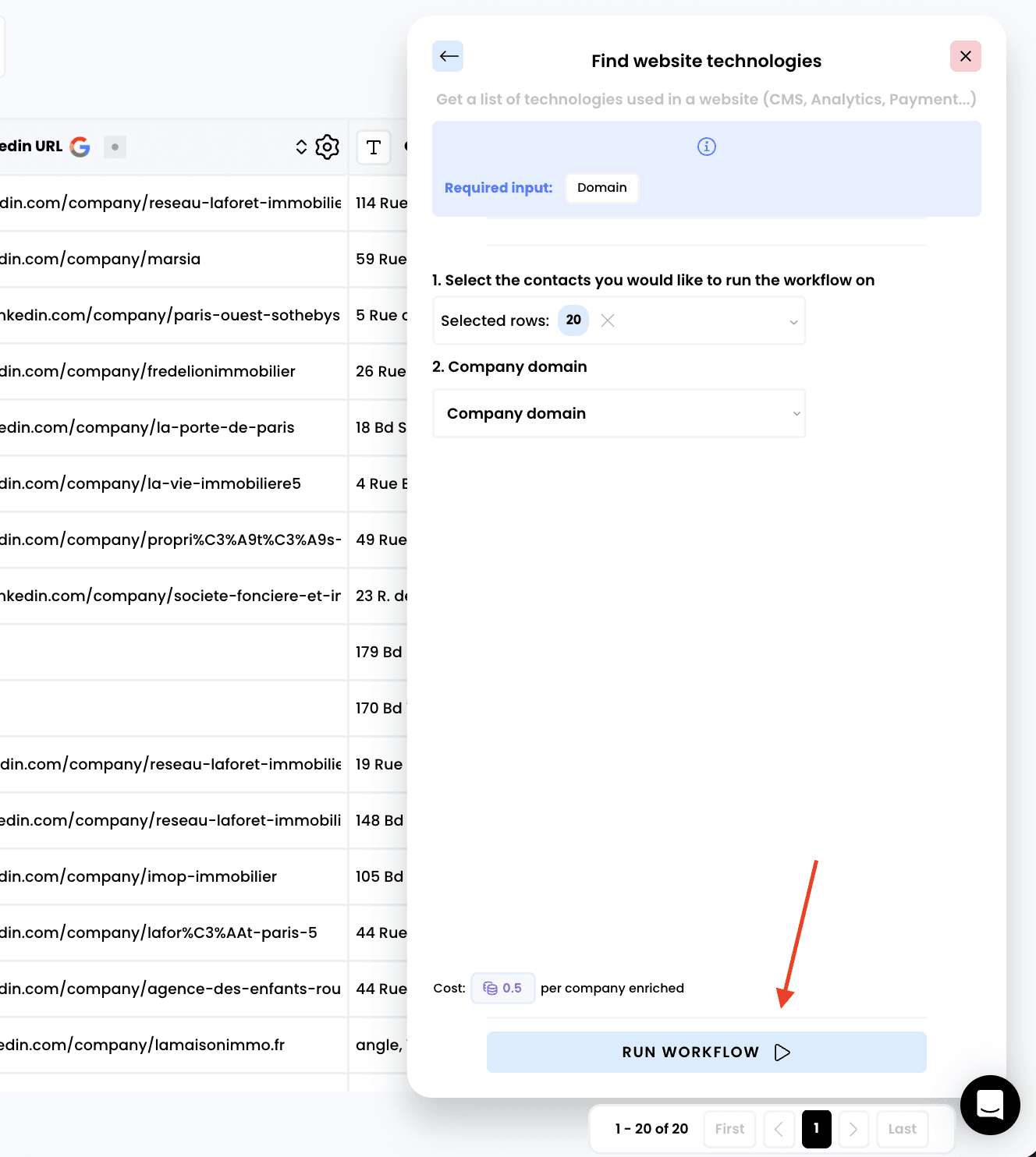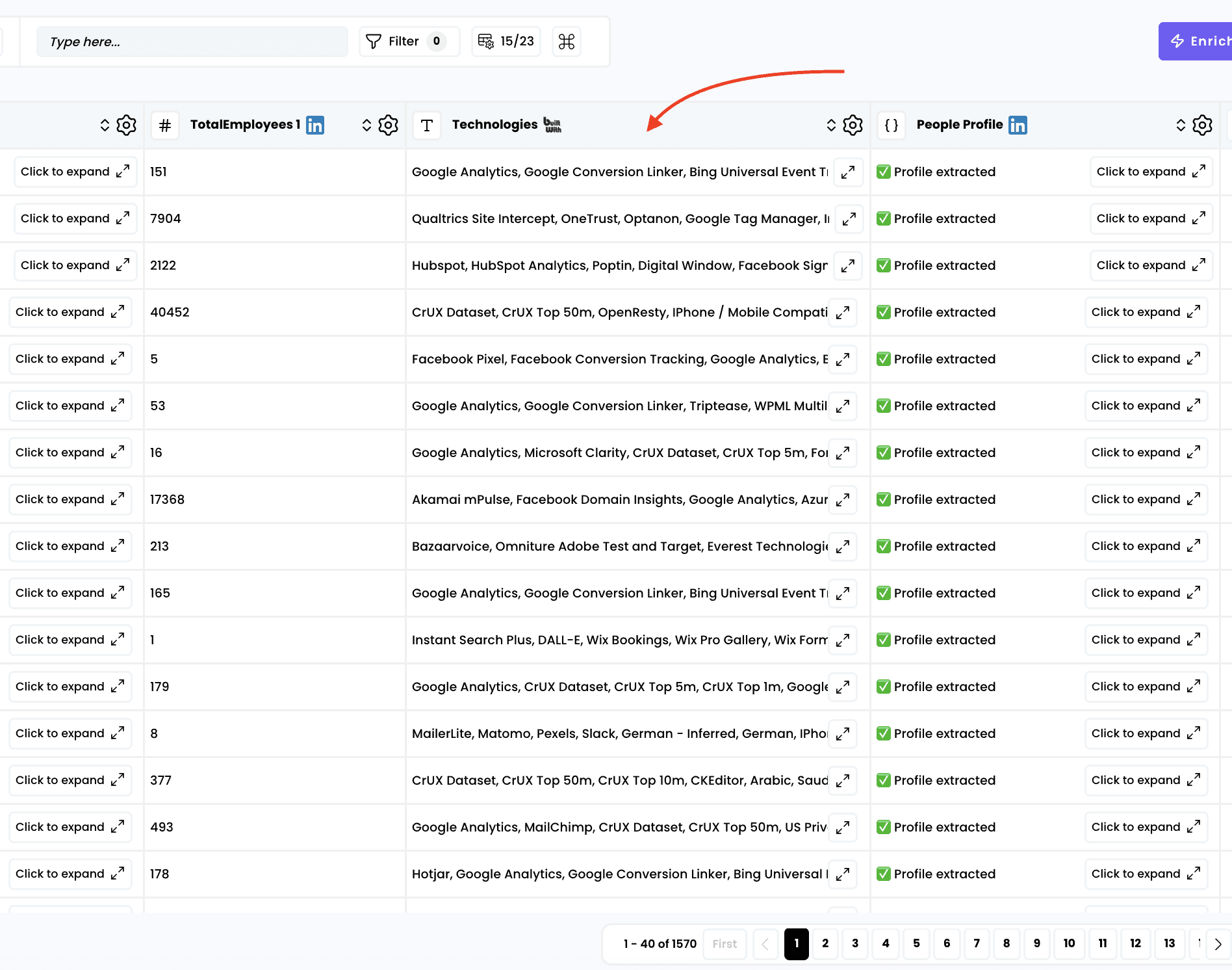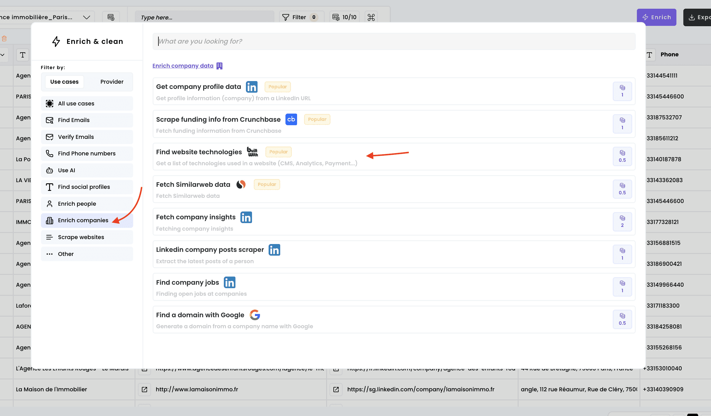 EnrichmentsFind company technologies1. Select the enrichment2. Select the rows to enrich3. Run the workflow4. Access the resultsPreviousFind a company domainPreviousFind a company domainPreviousNextFind company funding dataNextFind company funding dataNextNeed help? Contact SupportQuestions? Contact SalesOn this pageTitle