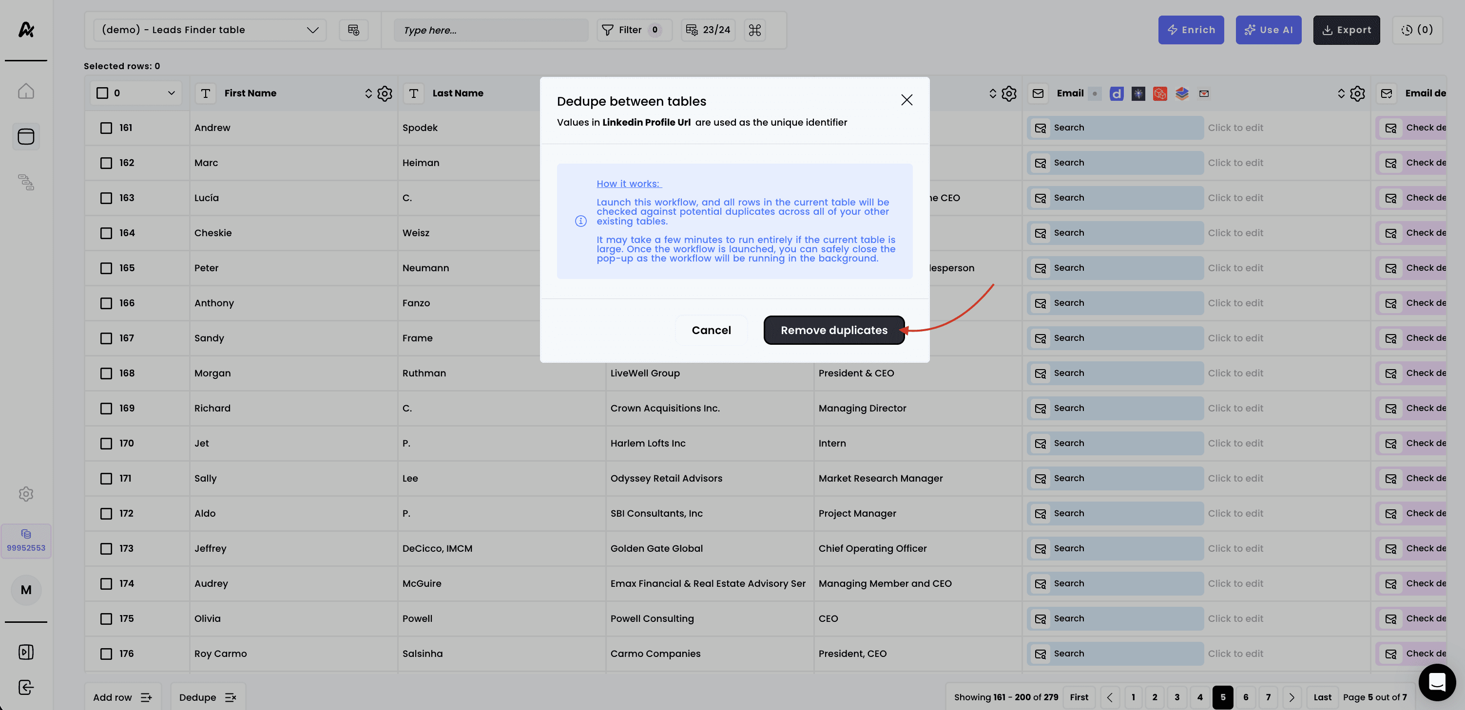 Launch this workflow and all rows in the current table will be checked for potential duplicates across all your other existing tables. If duplicates are found, the corresponding row in the table will be deleted