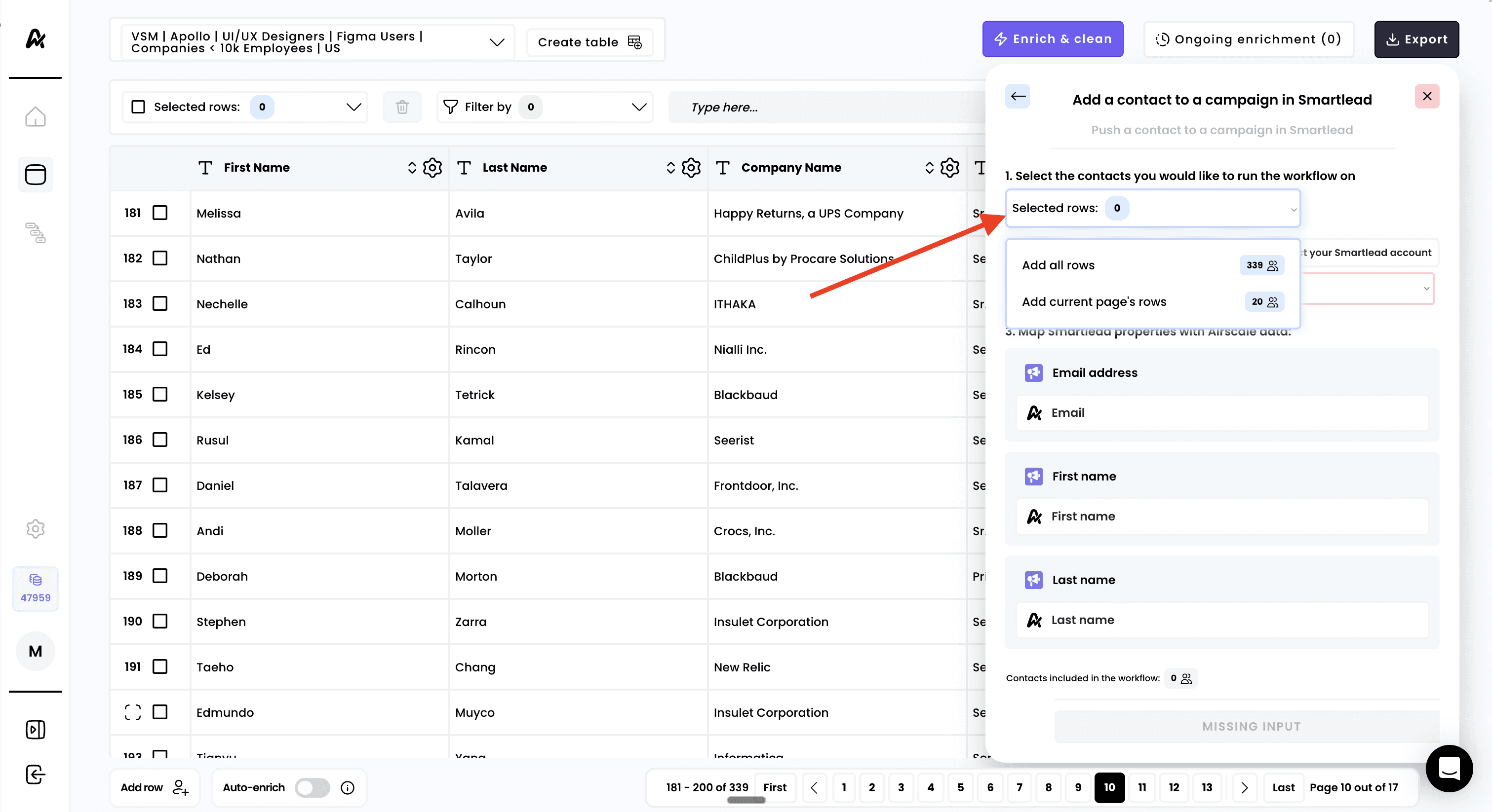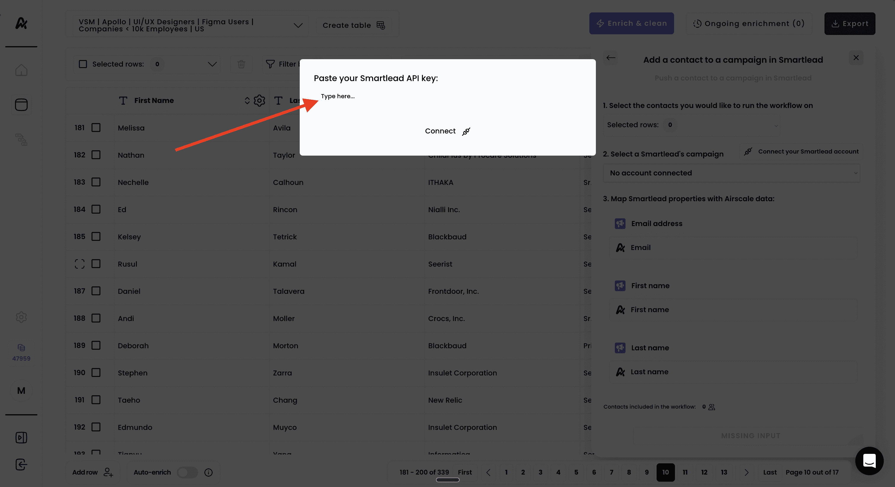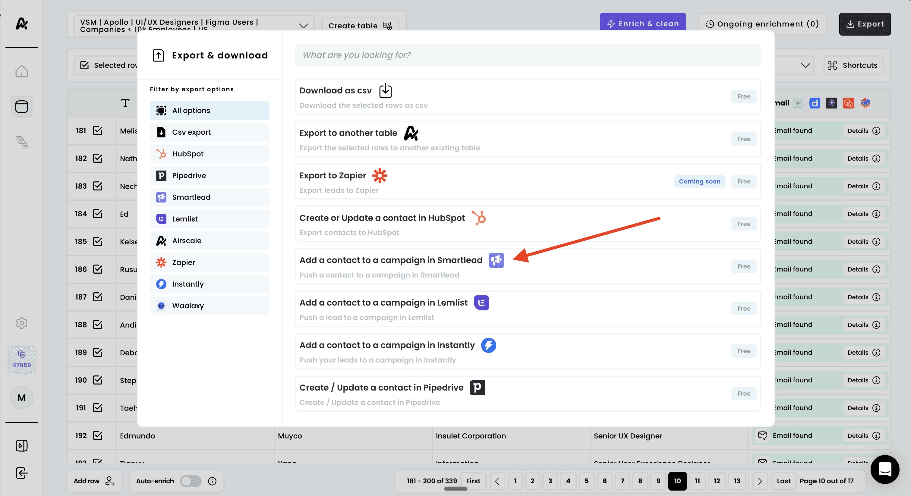 Export your prospects directly from Airscale to Smartlead campaigns for automated email outreach. This integration streamlines your workflow by pushing enriched prospect data directly into your email sequences without manual uploads or CSV exports.