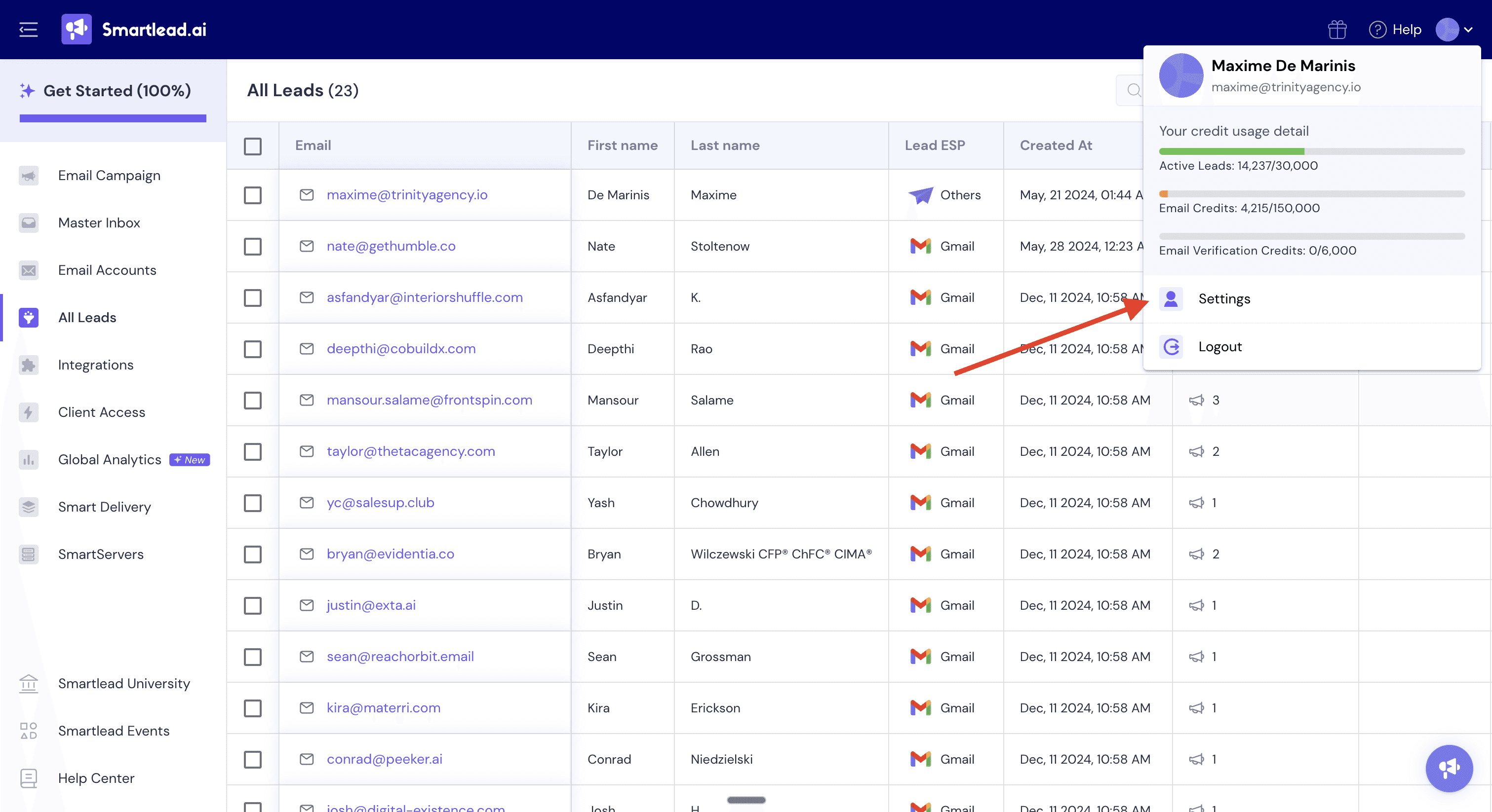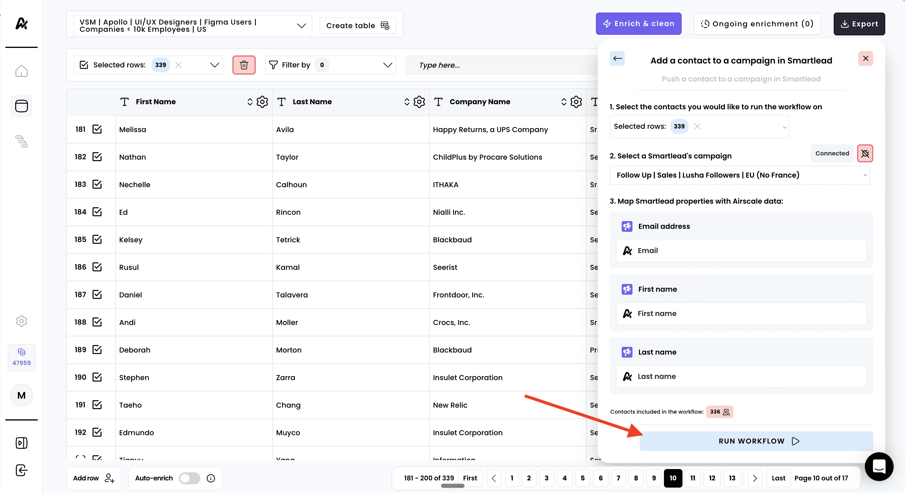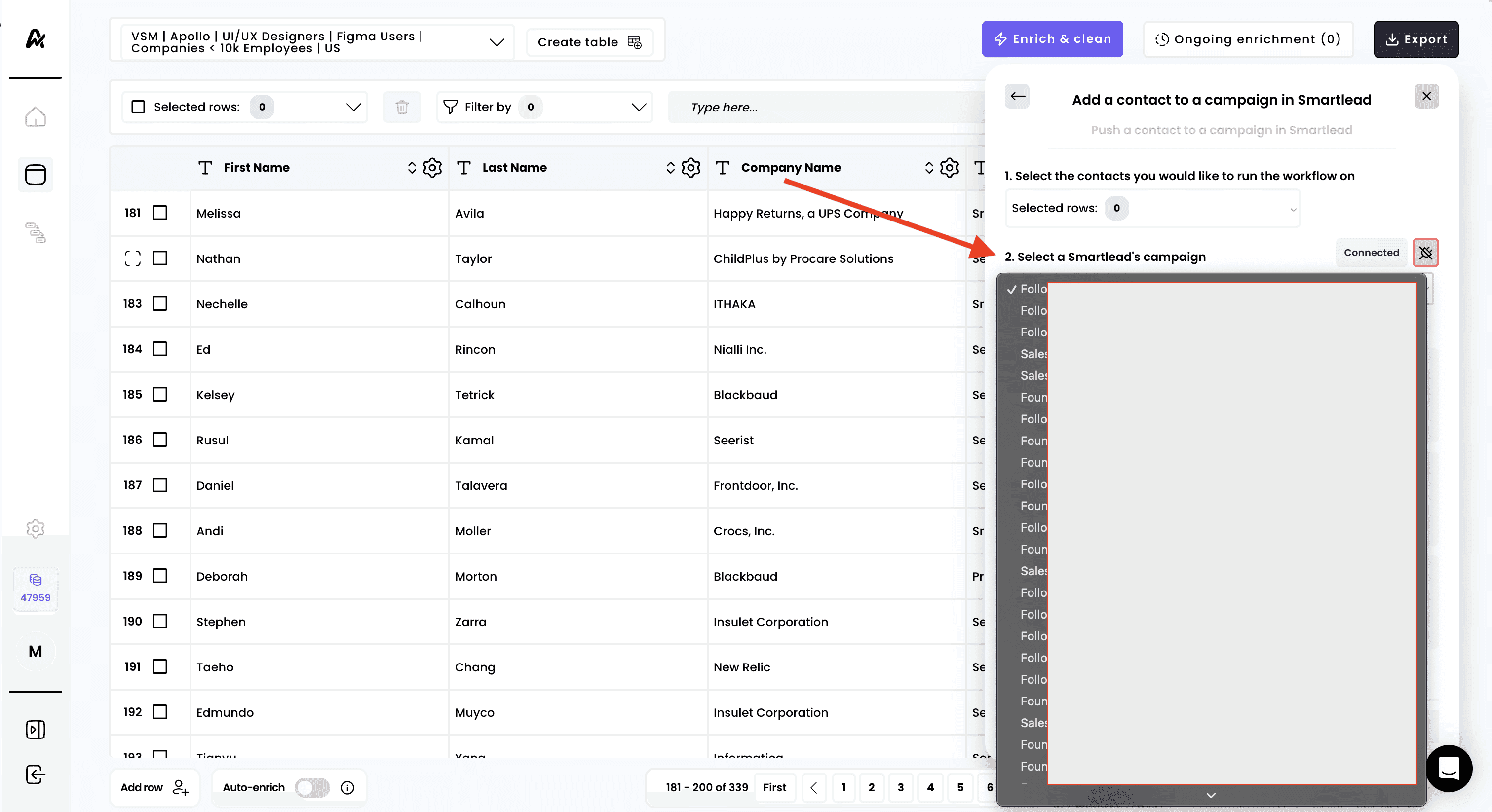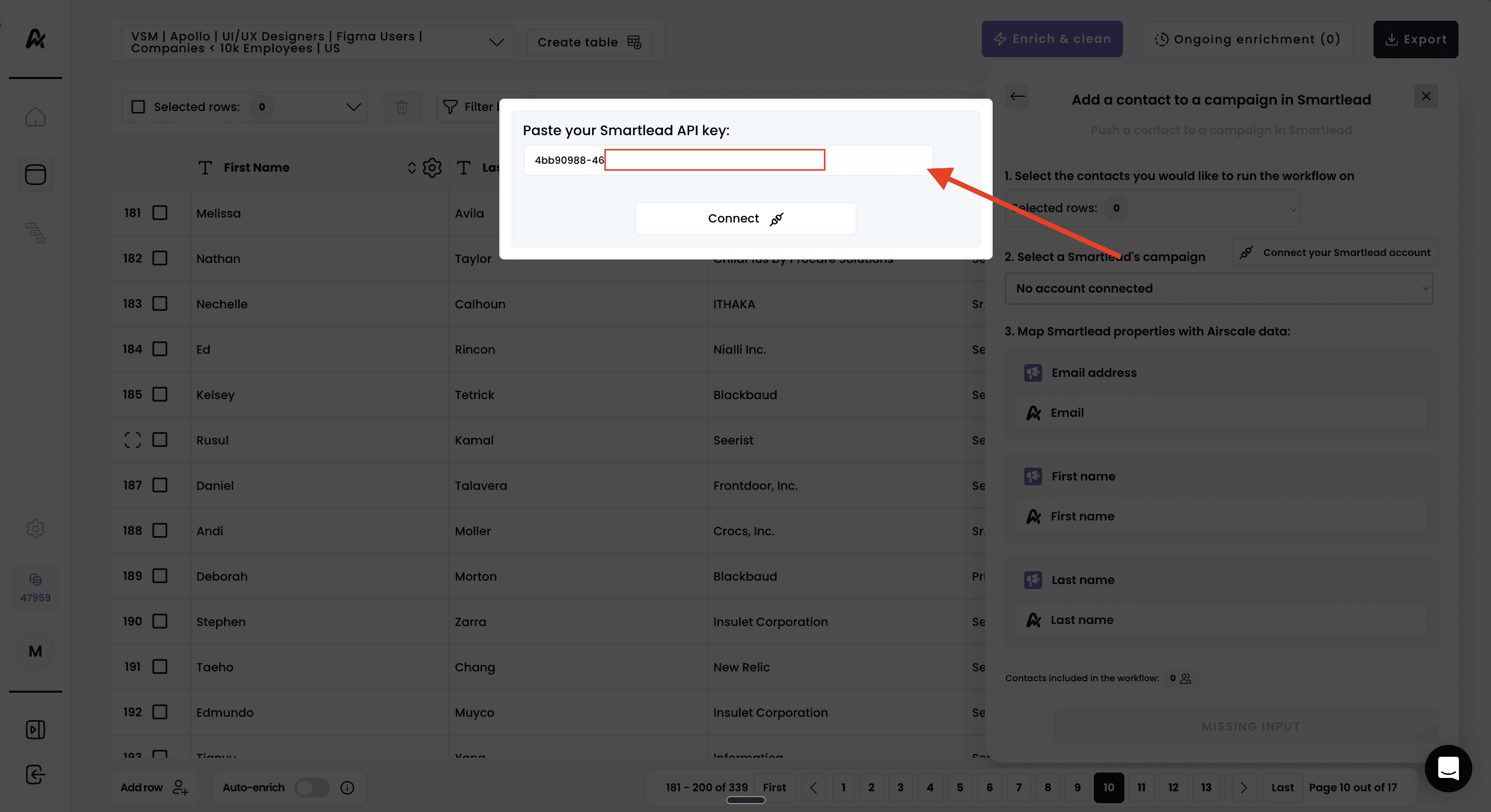 Export your prospects directly from Airscale to Smartlead campaigns for automated email outreach. This integration streamlines your workflow by pushing enriched prospect data directly into your email sequences without manual uploads or CSV exports.