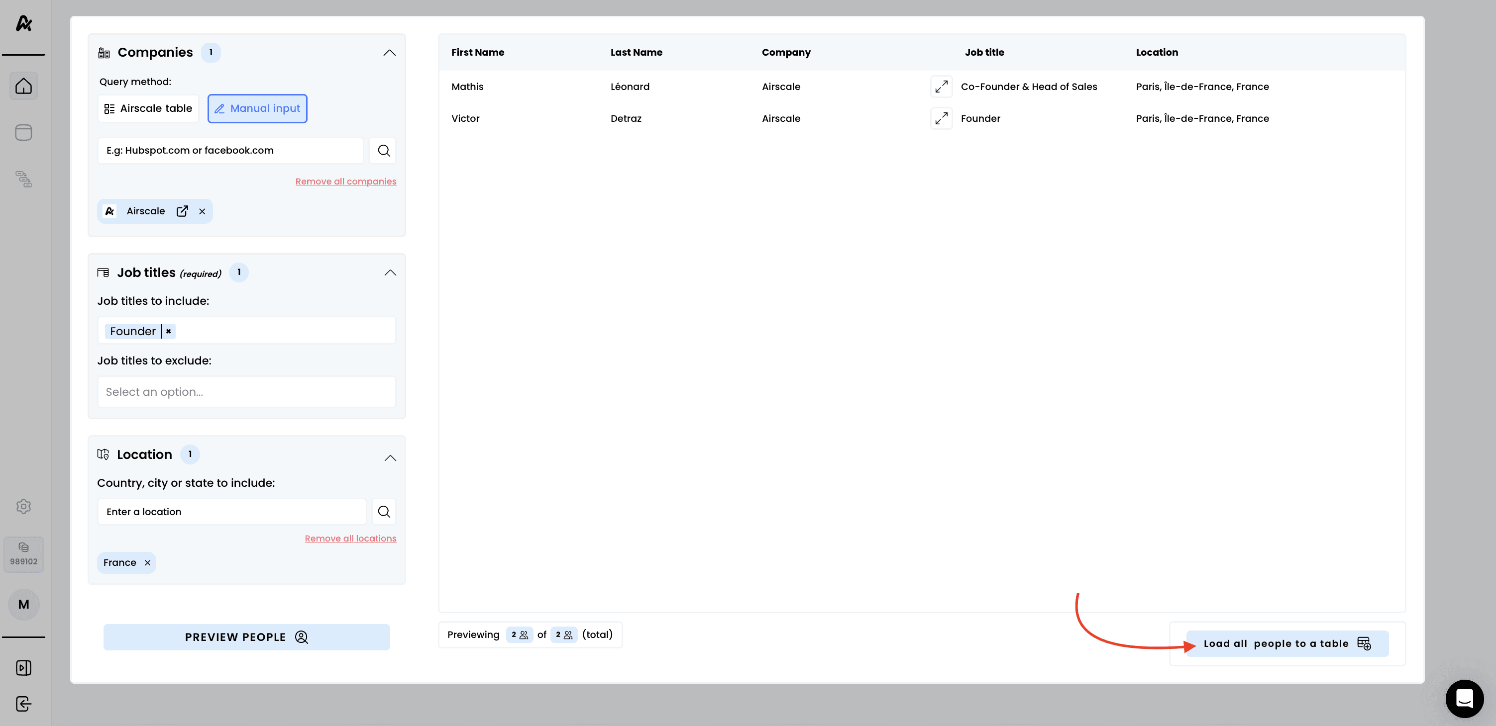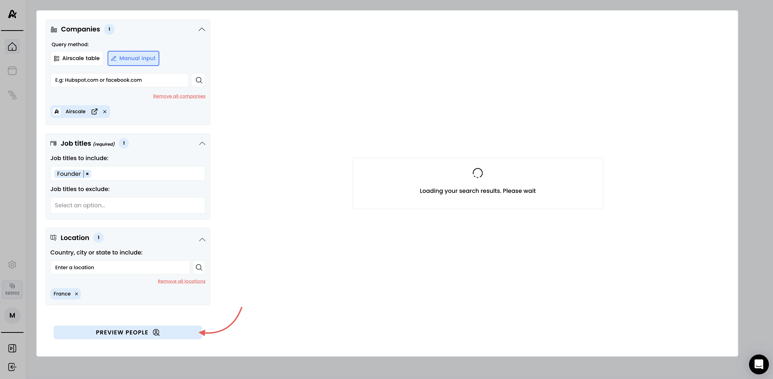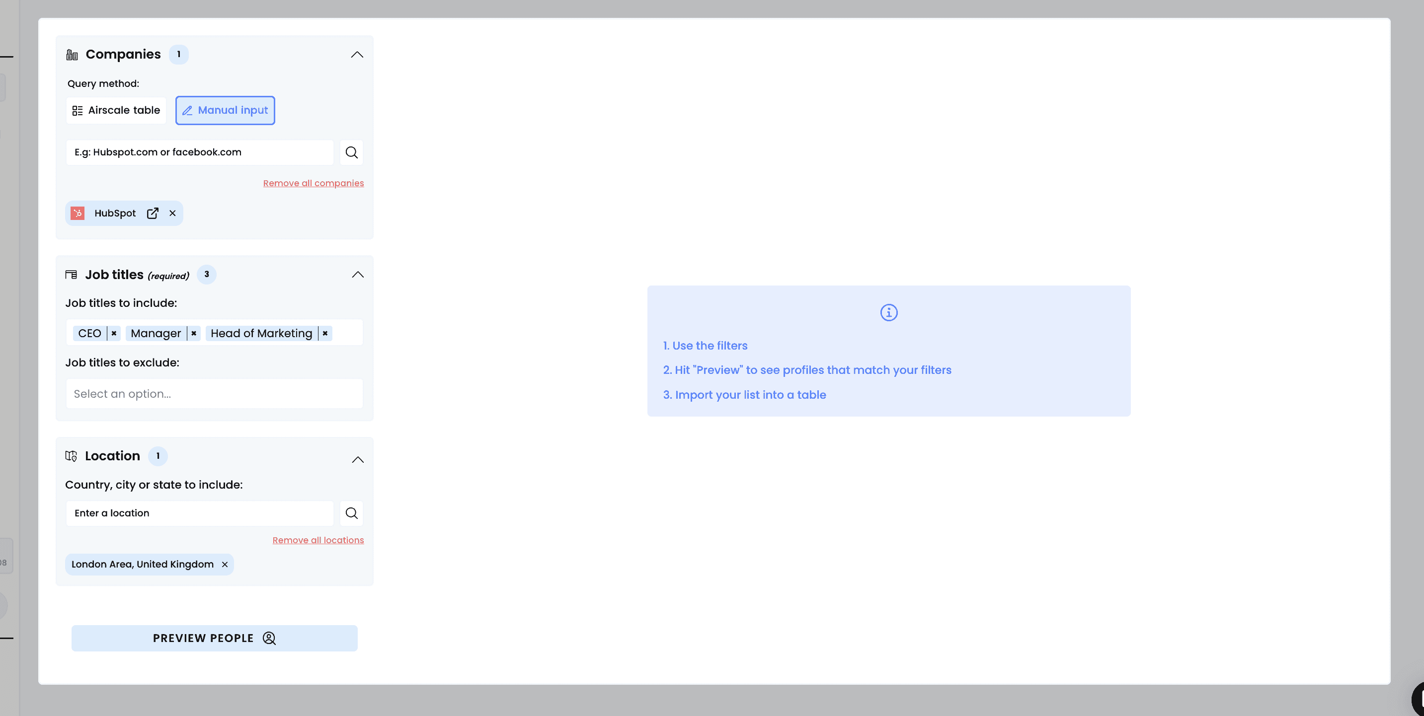 Use Airscale's built-in people search to discover prospects based on company, job title, location, and other criteria. This powerful native feature helps you build targeted prospect lists without needing external tools or complex imports