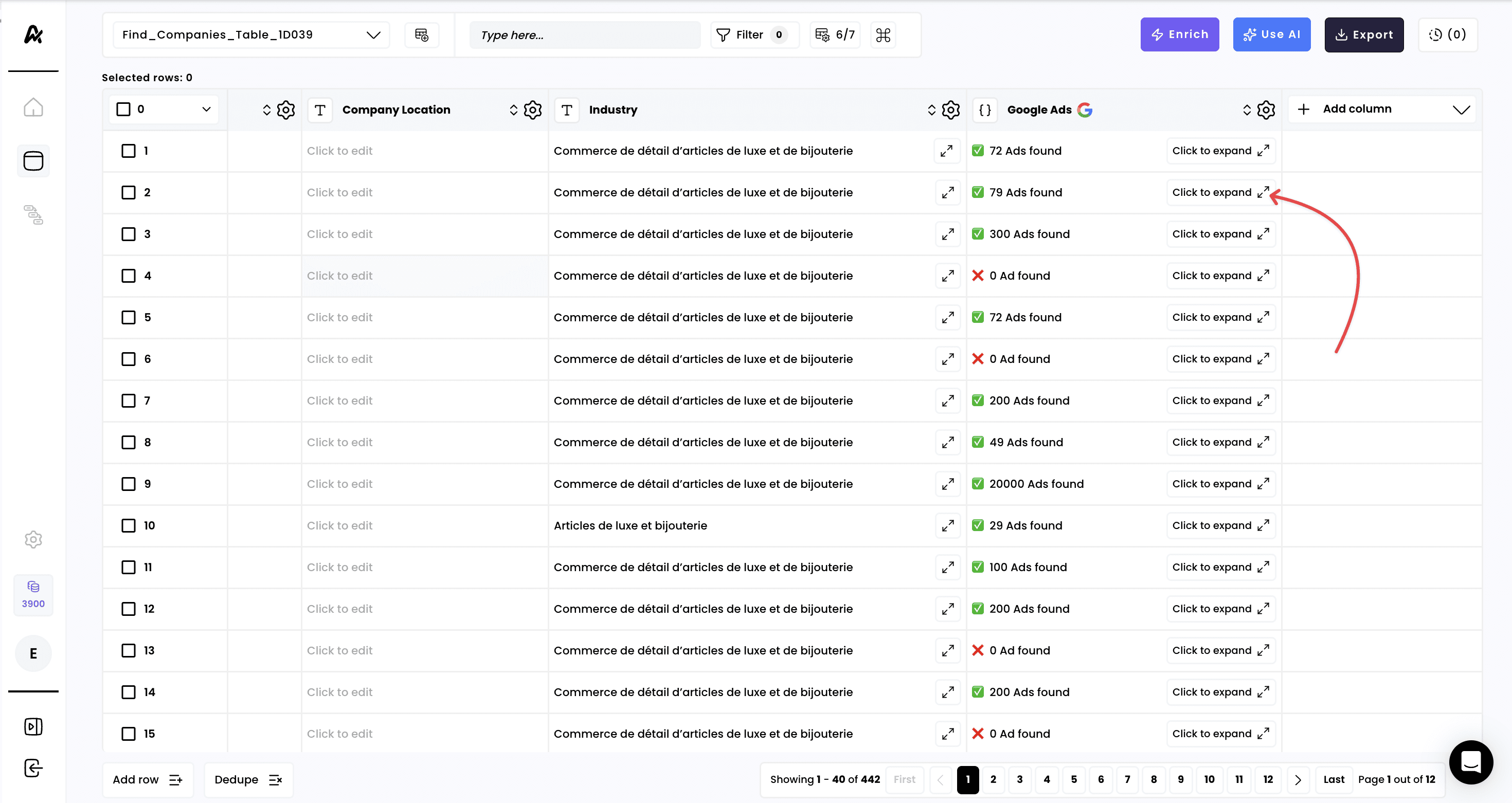 A new column is created automatically with the number of active ads. If you click on “Click to expand” you can access the detail of the enrichment