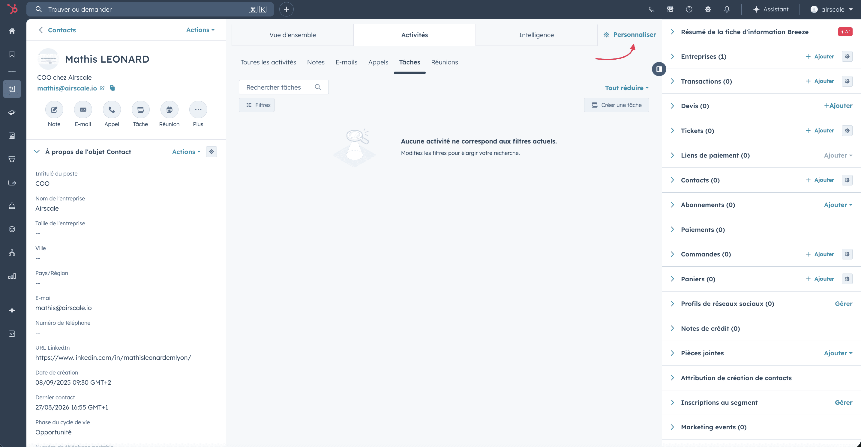On the contact record, click Customize in the top nav → select your view → make sure "Airscale Enrichment" is enabled.