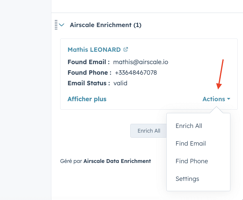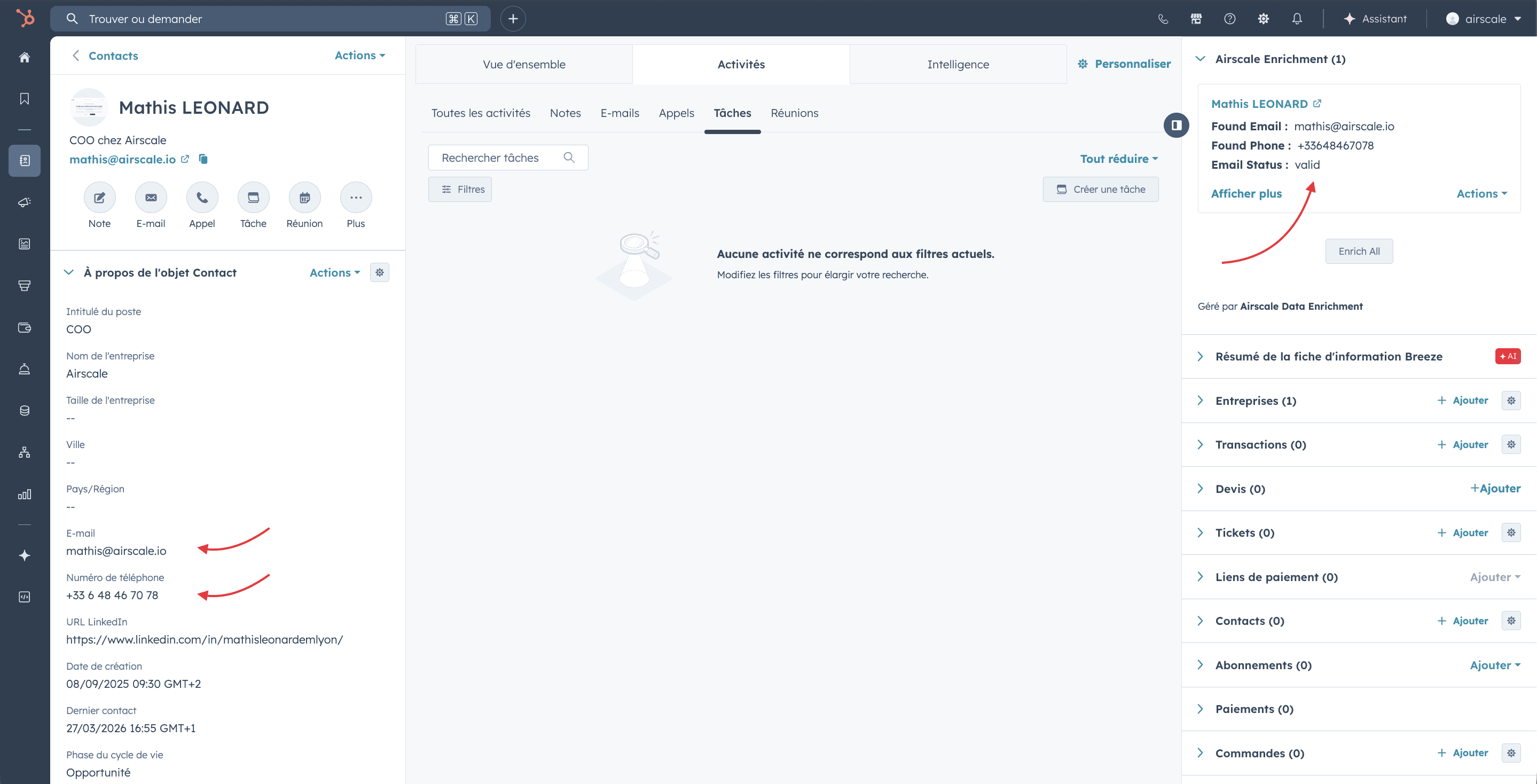 In the Airscale card: Found email, Found phone, Status, Enrichment date