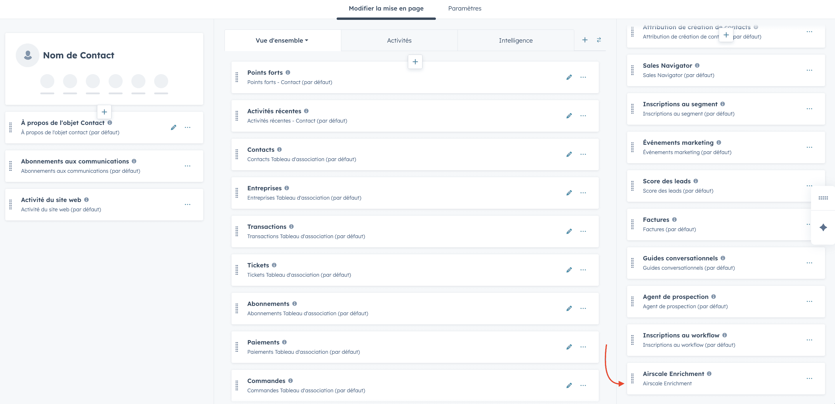 In the sidebar customization panel, locate the Airscale Enrichment card and drag it to the top (or just below "About this contact").