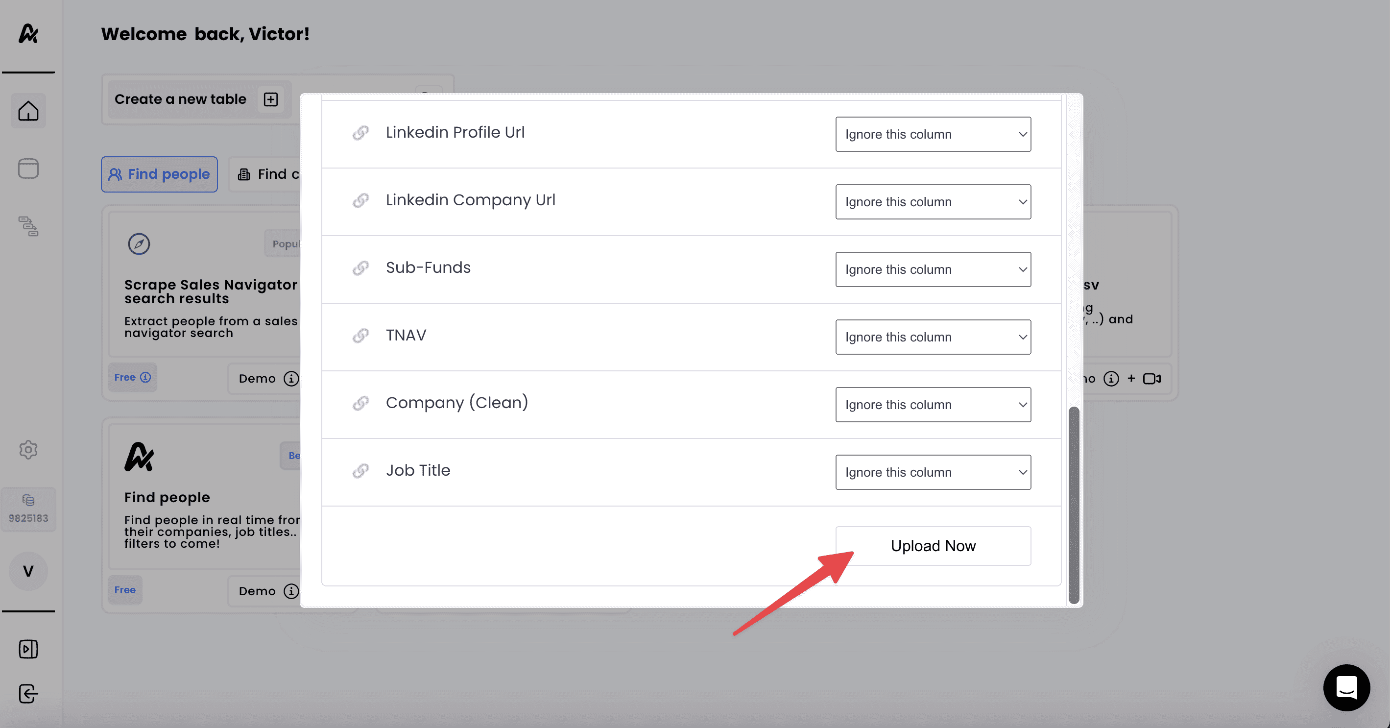 4. Click on "Upload Now" to create a table