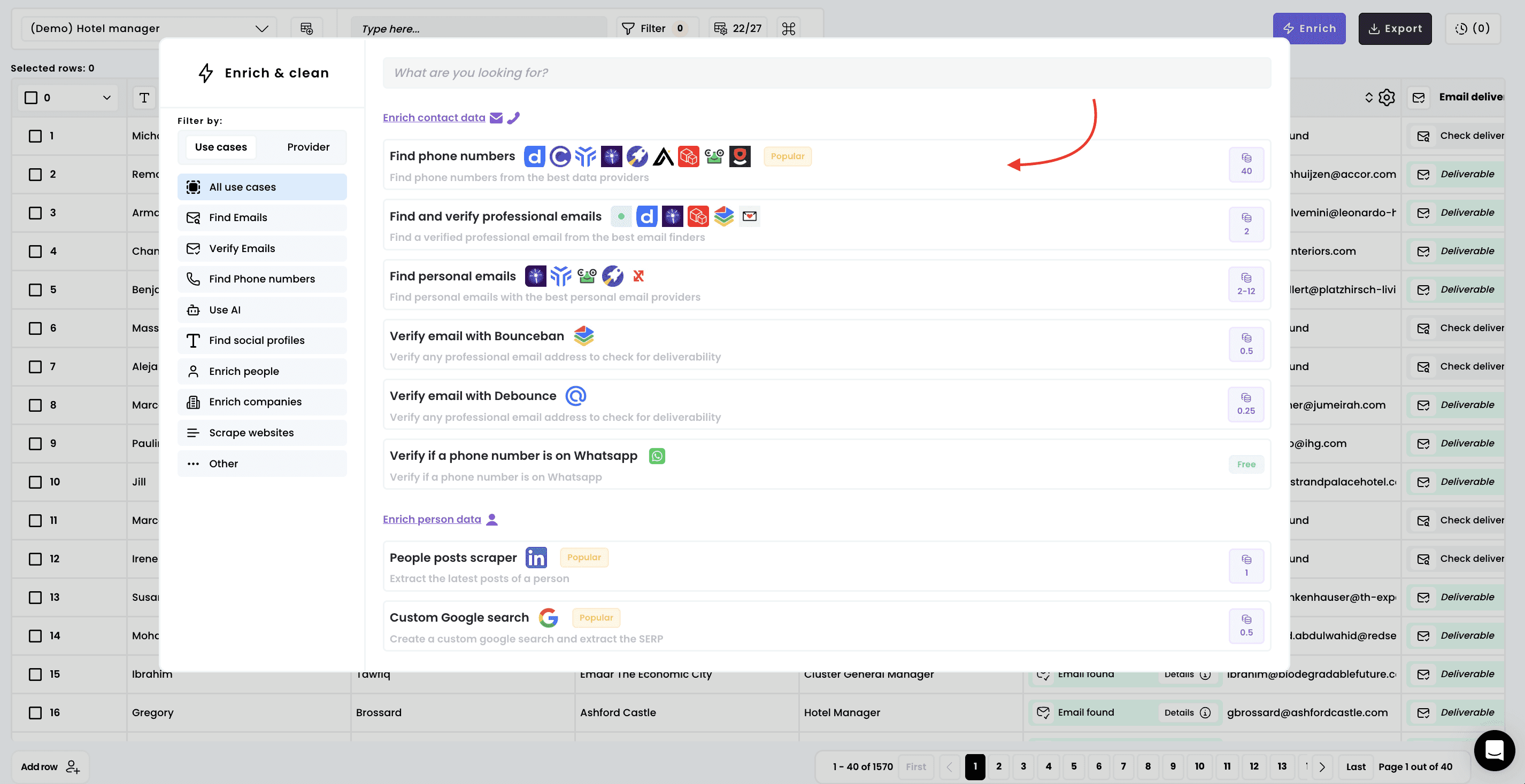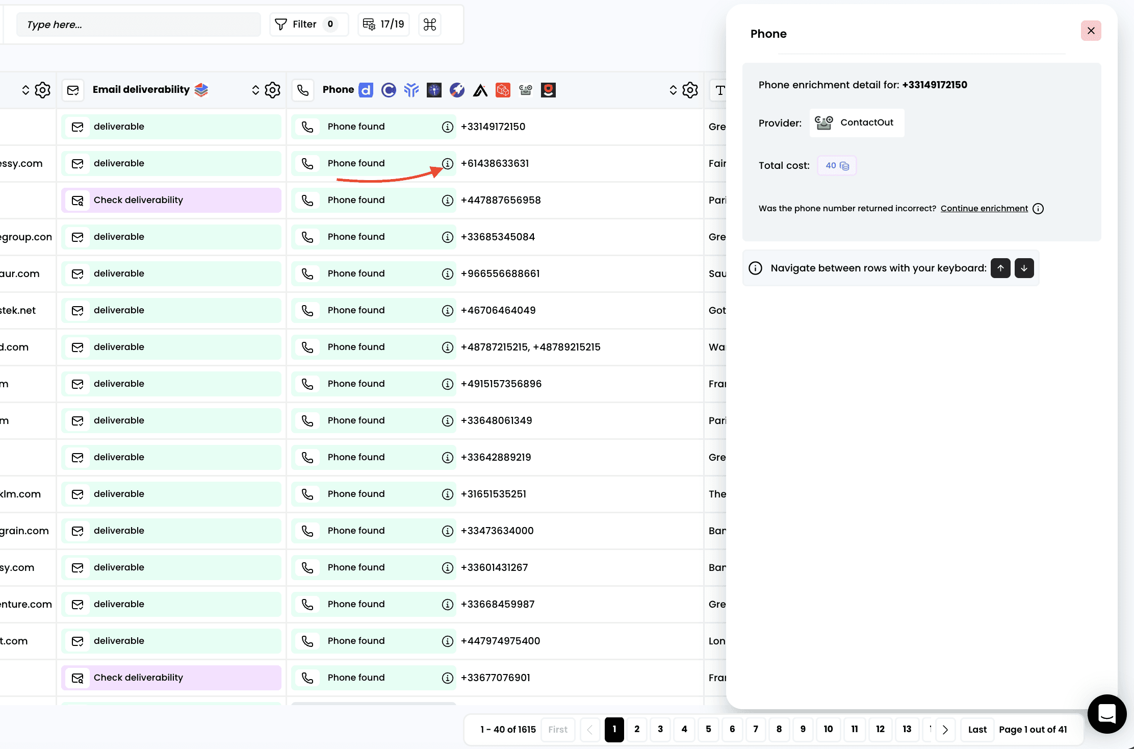 Once the enrichment is complete, you can see which provider returned the phone number by clicking the icon on the right
