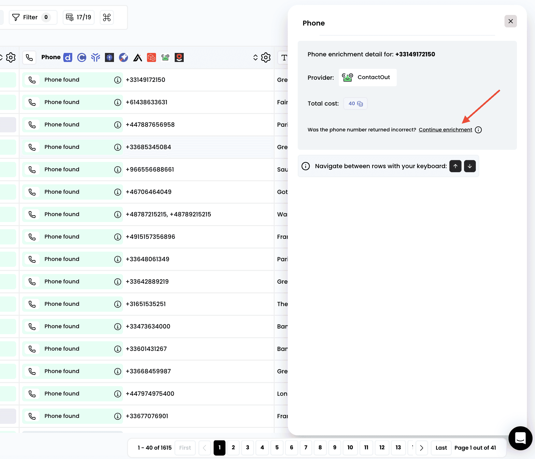 If you notice that the phone number returned is invalid, you can click on "Continue enrichment"
