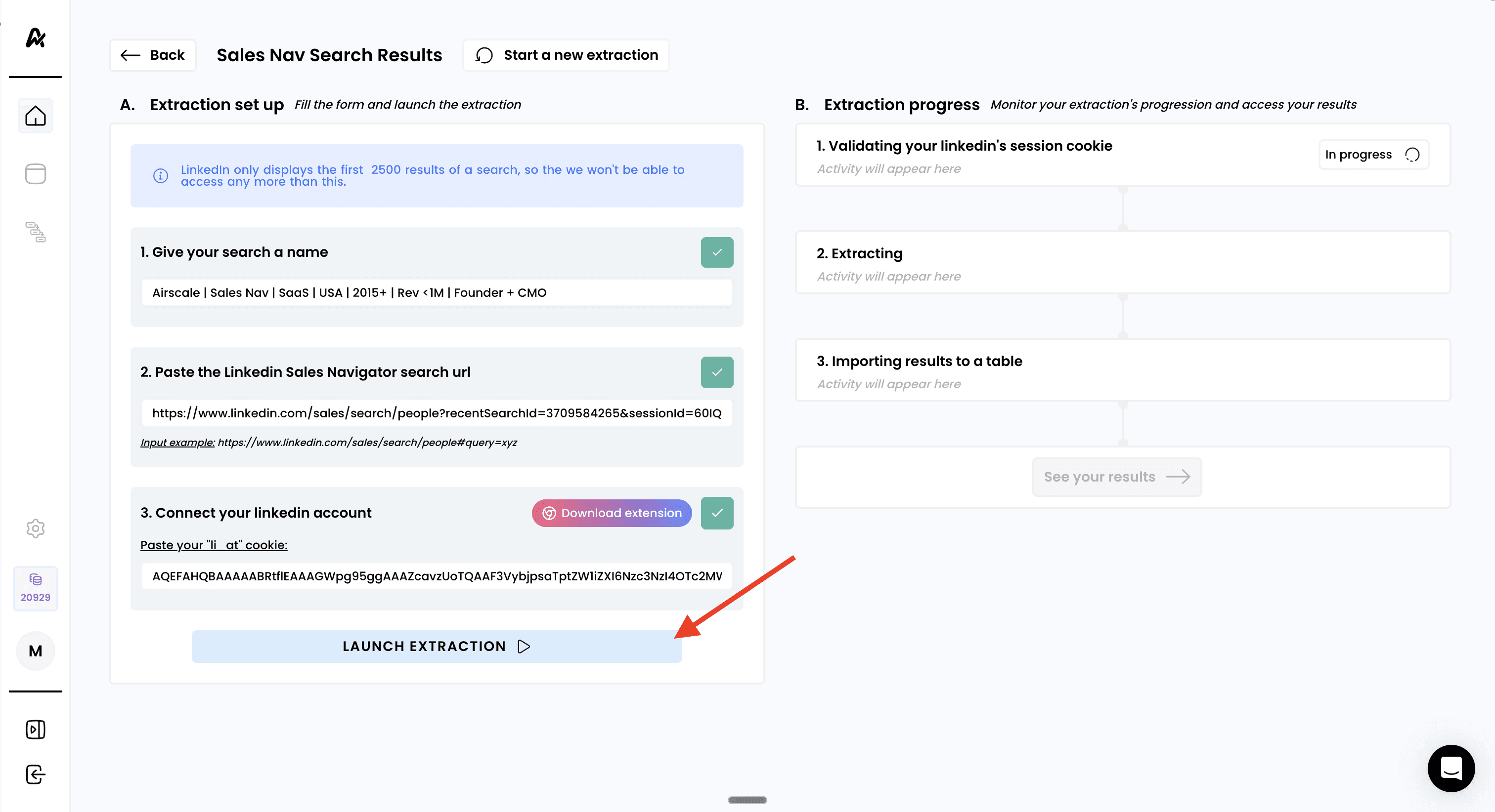 Click "LAUNCH EXTRACTION" to begin the scraping process